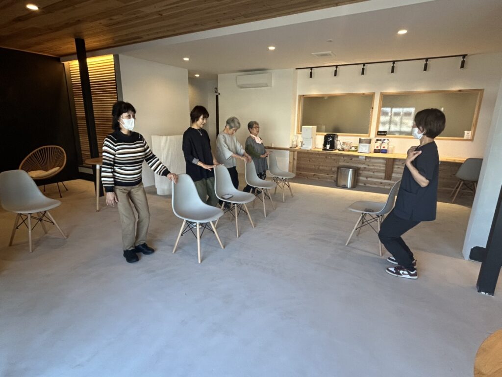 体調チェックのあとに、ストレッチで筋肉や関節をほぐしてから、上半身や下半身の筋力、平衡バランス機能の維持向上、姿勢矯正、転倒予防を目的とした30分程度の健康体操を行っています。
